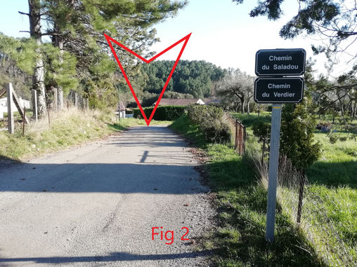 La randonnée est très bien balisée (balisage jaune). Au poteau « La Fabrègue », prenez la direction « Pont de l’Amous » qui se trouve à quelques pas. Au poteau « Pont de l’Amous » prenez la direction « Le Querier ». Une fois arrivez au poteau « Le Querier », prenez la direction de « Le Faou » en traversant l’Amous. Au poteau « Le Faou » prenez la direction de « La Cabanette ». A « La Cabanette », prenez à gauche vers « CABRIES ». Juste après, ne suivez pas la flèche qui tourne vers la droite et continuez tout droit (Fig 1). Continuez toujours tout droit et vous arrivez au poteau « Cabriès », prenez la direction de « La Salée ». Ensuite à « La Salée », prenez la direction de « La Vigne ». Il faut traverser le village puis tourner sur la gauche chemin du Saladou (Fig 2). Une fois au poteau « La Vigne », prenez la direction de « St SEBASTIEN D’AIG – La Fabrègue ». Bien suivre les deux indications qui vous font tourner à droite sur le chemin pour prendre une longue descente. Une fois à « Saint Sébastien d’Aigrefeuille la Fabrègue » prenez la direction de « La Fabrègue ». Vous traversez tout le village pour revenir à votre point de départ.